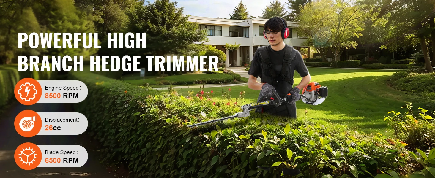 Efficient Trimming: Equipped with a 26CC 2-stroke engine and 8500rpm speed, the gas hedge trimmer offers powerful performance. The 6500rpm blade speed ensures sharp, efficient trimming of branches, shrubs, tea gardens, and green belts.